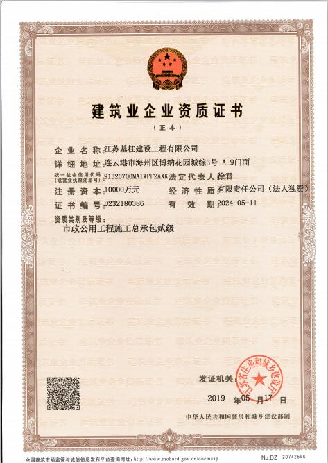 近日,我集团下属江苏基柱建设工程有限公司市政公用工程施工总承包贰级资质申报成功,并顺利通过江苏省住房和城乡建设厅的审核认定,取得相关证书。