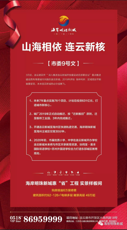 2019年伊始,全国多地楼市出台“松绑”政策,取消限价、限购、房贷减轻,可预见的是:楼市回暖、势不可挡,这无疑是对持币观望民众的一大利好。与此同时,3月初连云港市【市委9号文】明确指出,未来7年投资631亿打造连云新城,同时启动碱厂搬迁工程及连云新城至海州区快速轨道交通1号线的建设!