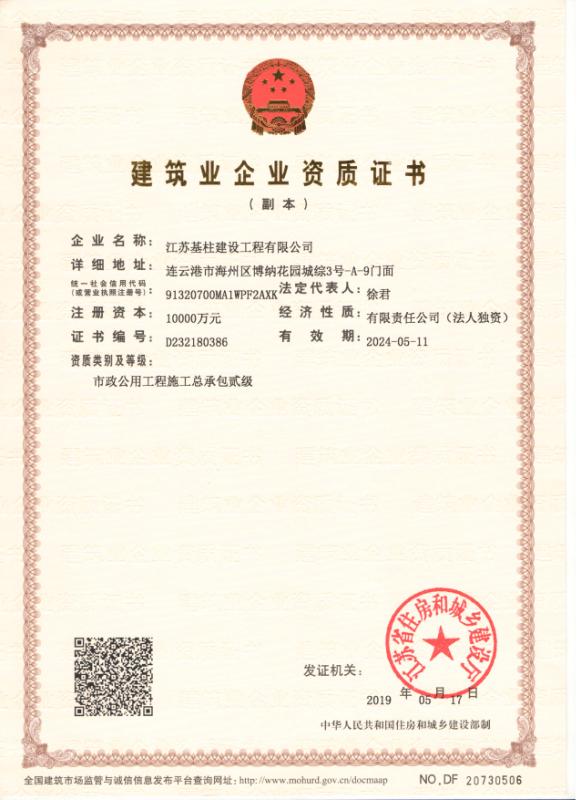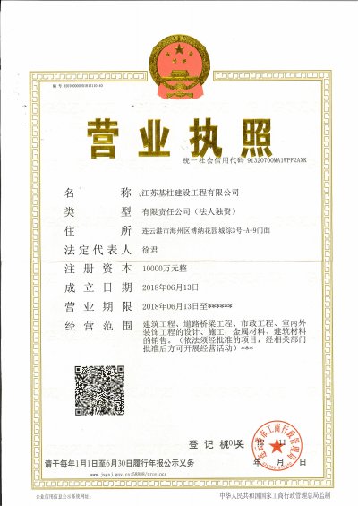 江苏基柱建设工程有限公司属苏北建设集团全资子公司,注册资金10000万元整,主要经营大型建筑工程、大型市政公用工程、园林绿化工程、大型道路桥梁工程和室内外装饰工程等,江苏基柱先后取得了建筑工程施工总承包壹级资质,市政二级资质和省级安全生产许可证。江苏基柱多年来秉承“合作共赢,品质第一”的经营理念,持续、快速、健康地发展,取得了辉煌的经营业绩。在建筑安装方面:建设了虎平路、临洪路、新光路等市政公用工程项目;承接了滨海新区填海工程;建成了康缘药业集团中药智能化固体制剂工厂项目、康缘健康园区主门户项目、伍江数码科技园、亿隆城建等大型工厂项目;承办了花果山大道绿化、板桥绿化等市容市貌工程;建设并成功招商连云区大润发超市项目;承建景山秀水小区二期项目。房地产开发方面:赣榆水岸明珠小区,以及正在开发区建设的16万平方米--海岸明珠新城小区。
