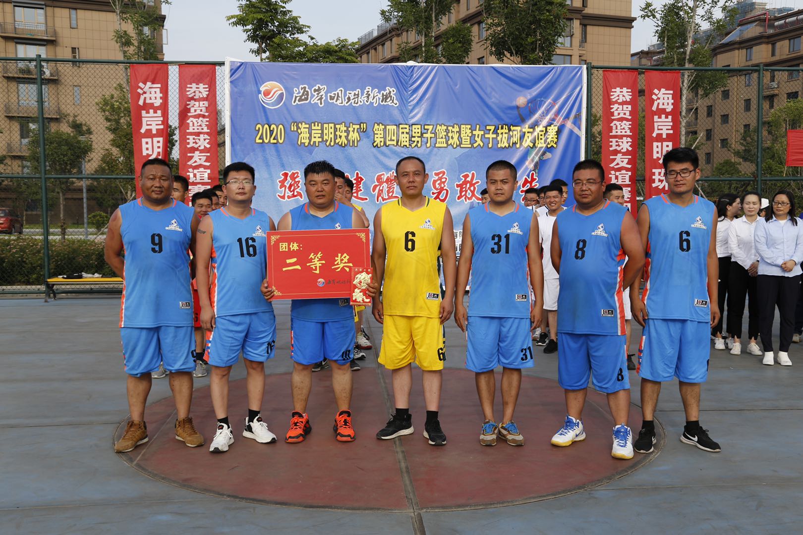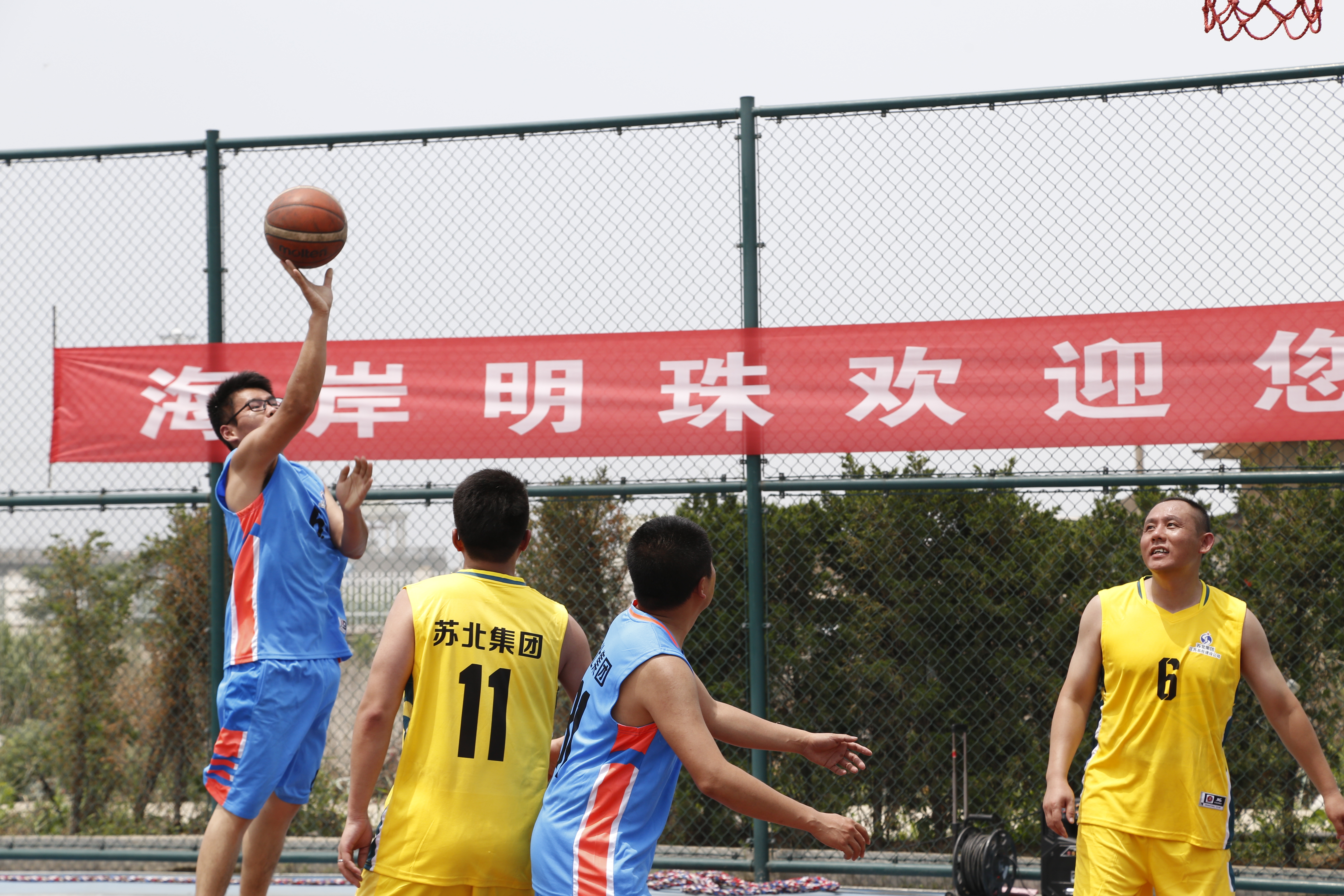 生如夏花之灿烂,在这热情洋溢的季节,上午8点58分,苏北集团迎来了“强身健体、勇敢争先”2020海岸明珠杯第四届男子篮球暨女子拔河友谊赛。本次男子篮球赛共分4支球队,36名运动员参赛,实到32名;女子拔河比赛共分2队,18名女职工参加,实到18名。活动在运动员入场仪式下拉开帷幕,首先苏北集团董事长徐君先生致开幕词,裁判员、运动员代表分别宣誓。本次篮球赛采用淘汰制进行,在篮球赛现场公开抽取对抗双方。