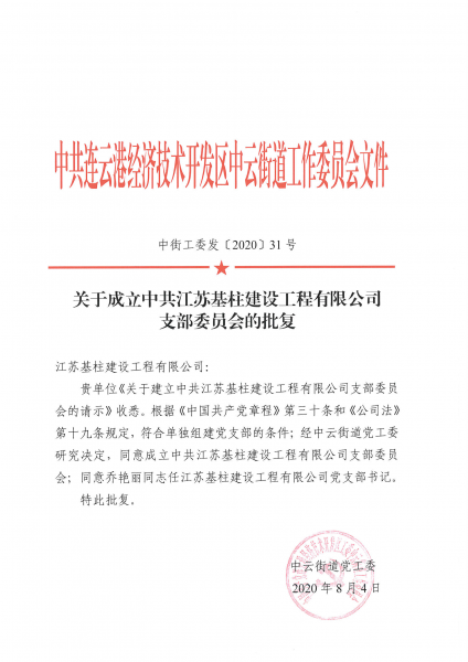 8 月 4 日,经中共连云港经济技术开发区工委中云街道工作委员会批复同意,中共江苏基柱建设工程有限公...
